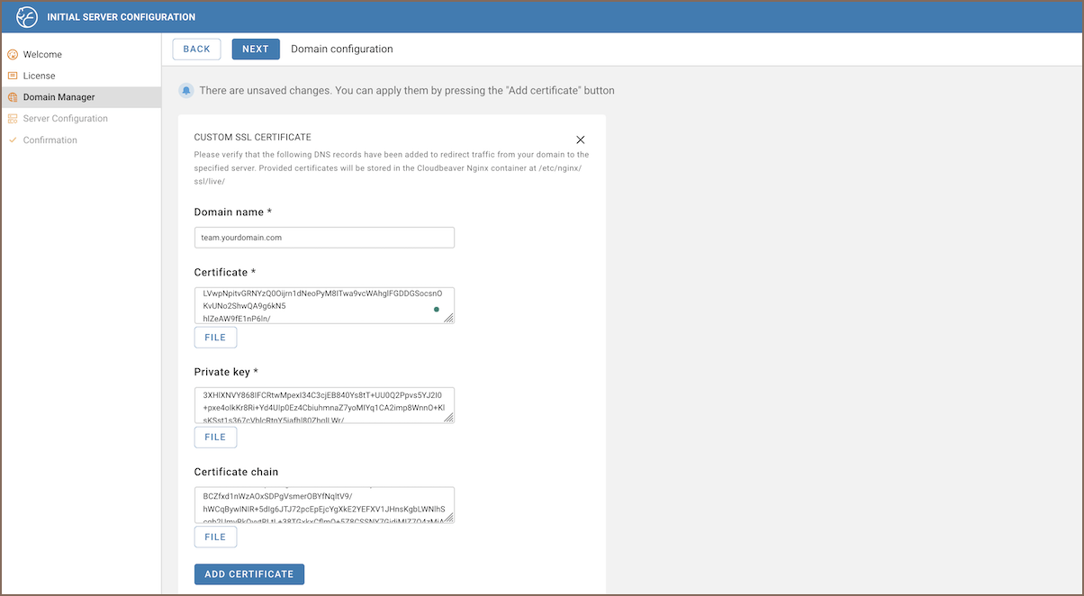 If you prefer to set up the domain manually, using a custom SSL certificate, follow these steps: