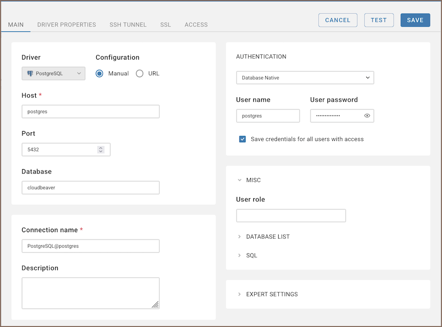 Typical PostgreSQL connection settings: