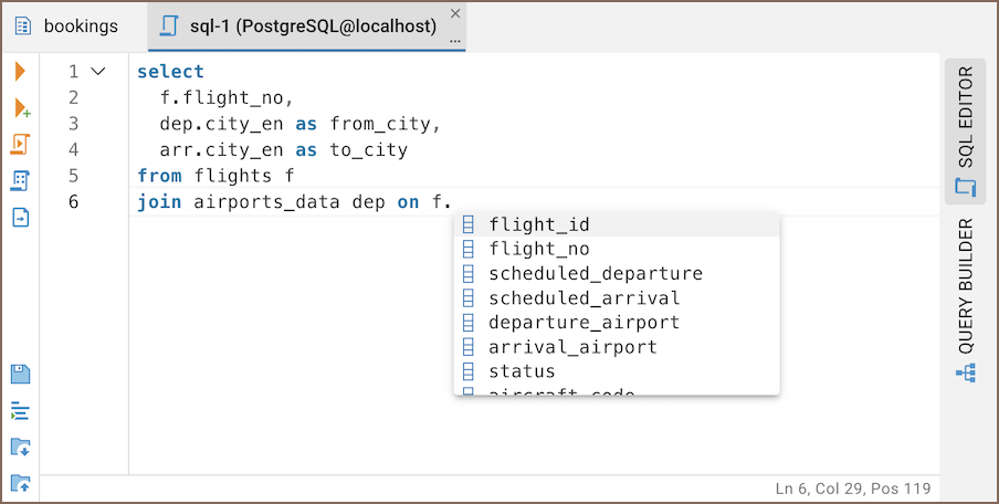 When you start typing an SQL code, Team Edition suggests auto-complete options based on the context.