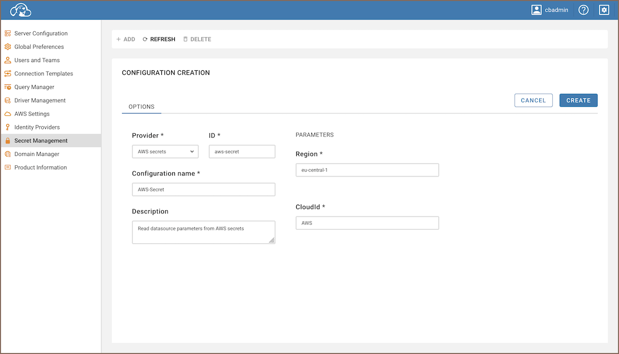 In the Create Connection wizard, go to the Main tab, choose a Secret Configuration ID and enter the Secret Name in the Secret Parameters section.