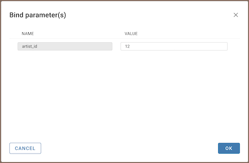 Users with Administrator or Developer roles can define dynamic parameters such as :artist_id in the dataset query.