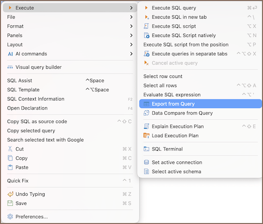 Use fetched rows, Selected rows only, and Selected columns only are available only when exporting from query results or the Data Editor. When exporting from the Database Navigator, or SQL script, data is always read directly from the database.