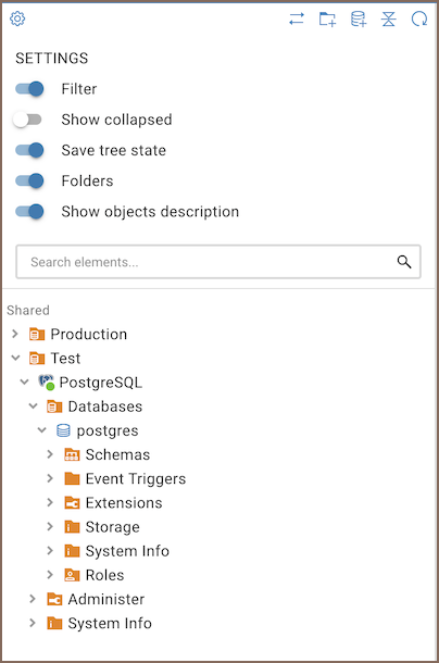 - Database objects (varying by database type, such as Tables, Views, Indexes, etc.)