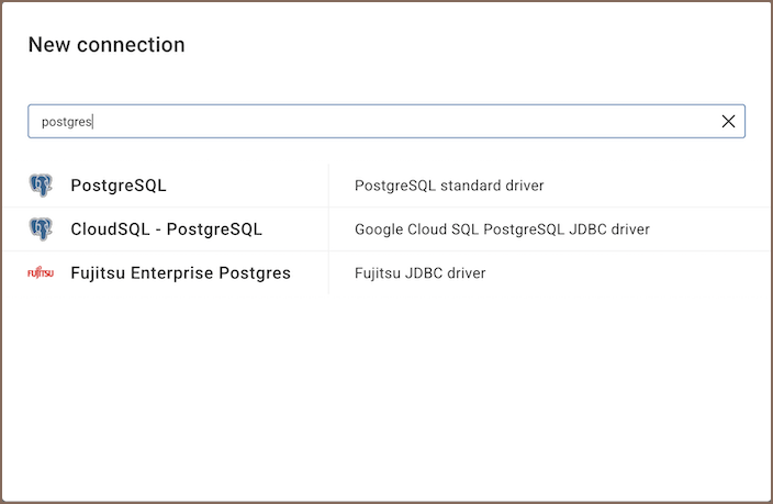 Team Edition also supports PostgreSQL extensions such as EDB, Google Cloud SQL for PostgreSQL and Fujitsu Enterprise Postgres. You must select the appropriate driver in the Connect to a database window for these extensions.