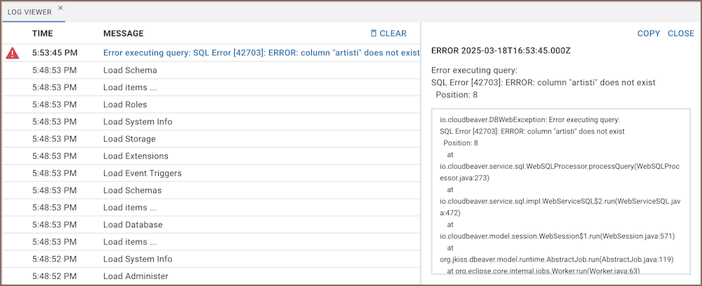 Logs appear with timestamps and brief descriptions. To get detailed info on a specific error: