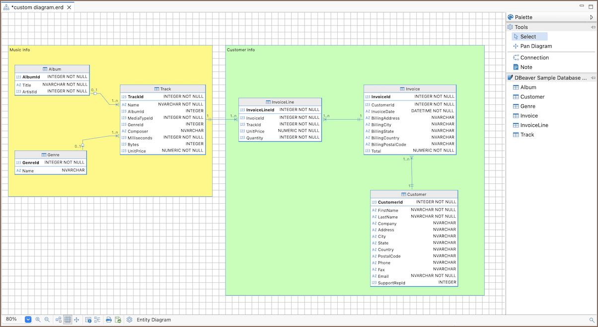 Custom diagrams let you work with database structure in a separate visual workspace. You can combine tables, relationships, and notes in a single diagram without modifying the database schema.