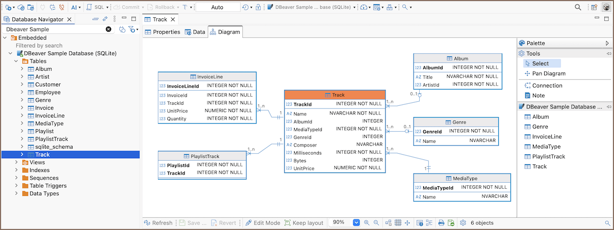 DBeaver supports diagrams for existing tables, schemas, and custom visualizations. You can select elements, adjust the layout, and export diagrams for further use. The interface includes: