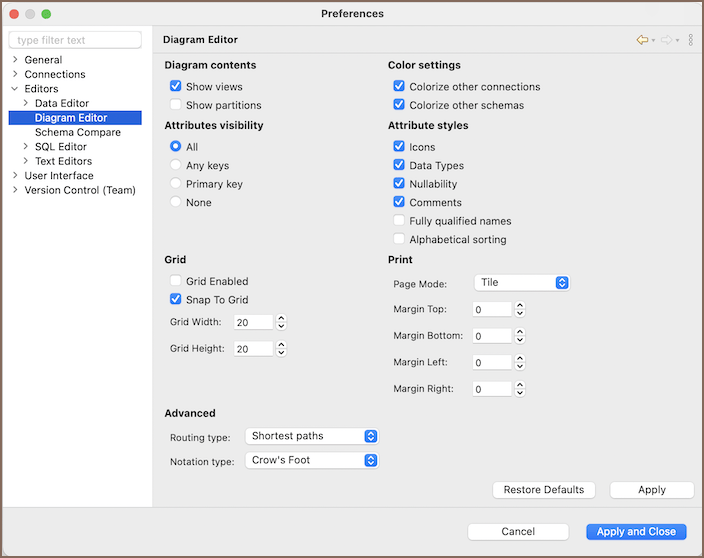 To customize how diagrams are displayed using global Diagram preferences, navigate to Window -> Preferences -> Editors -> Diagram Editor.