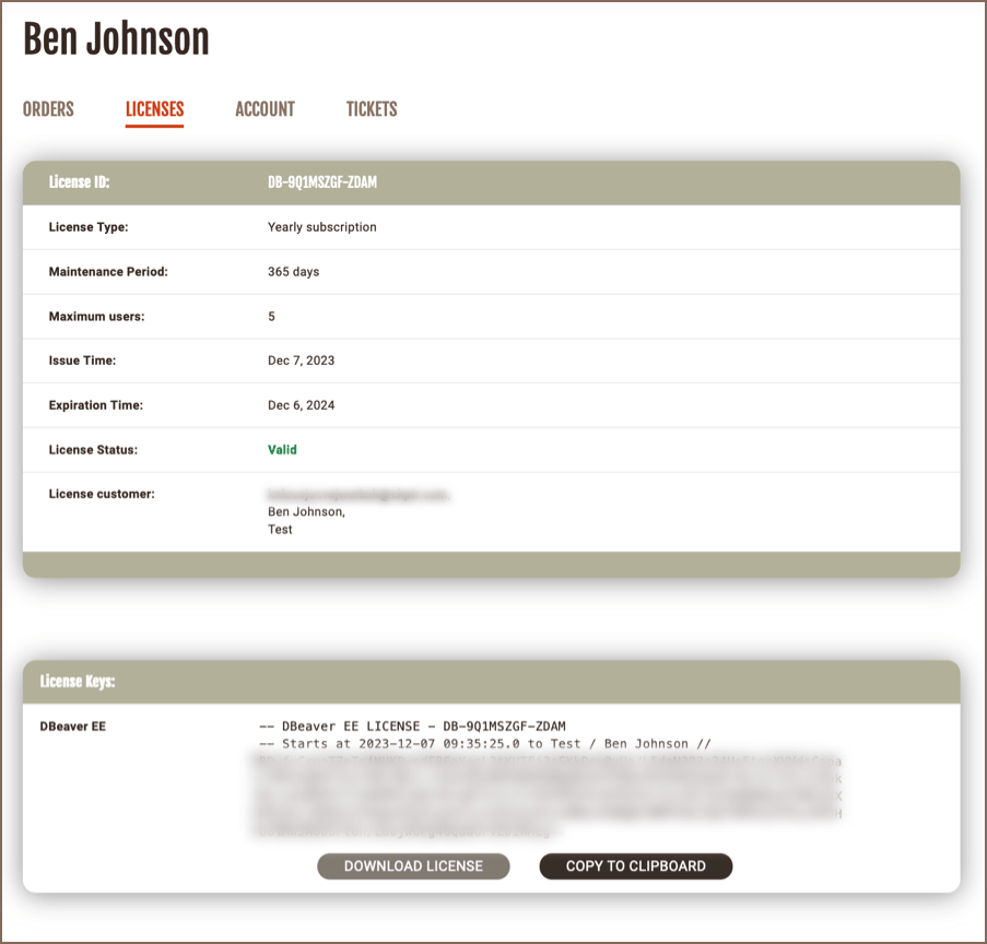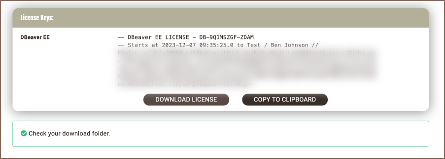 At the bottom of the page you can find the license key required to start using DBeaver. There are two options how to copy your license key from the personal account: