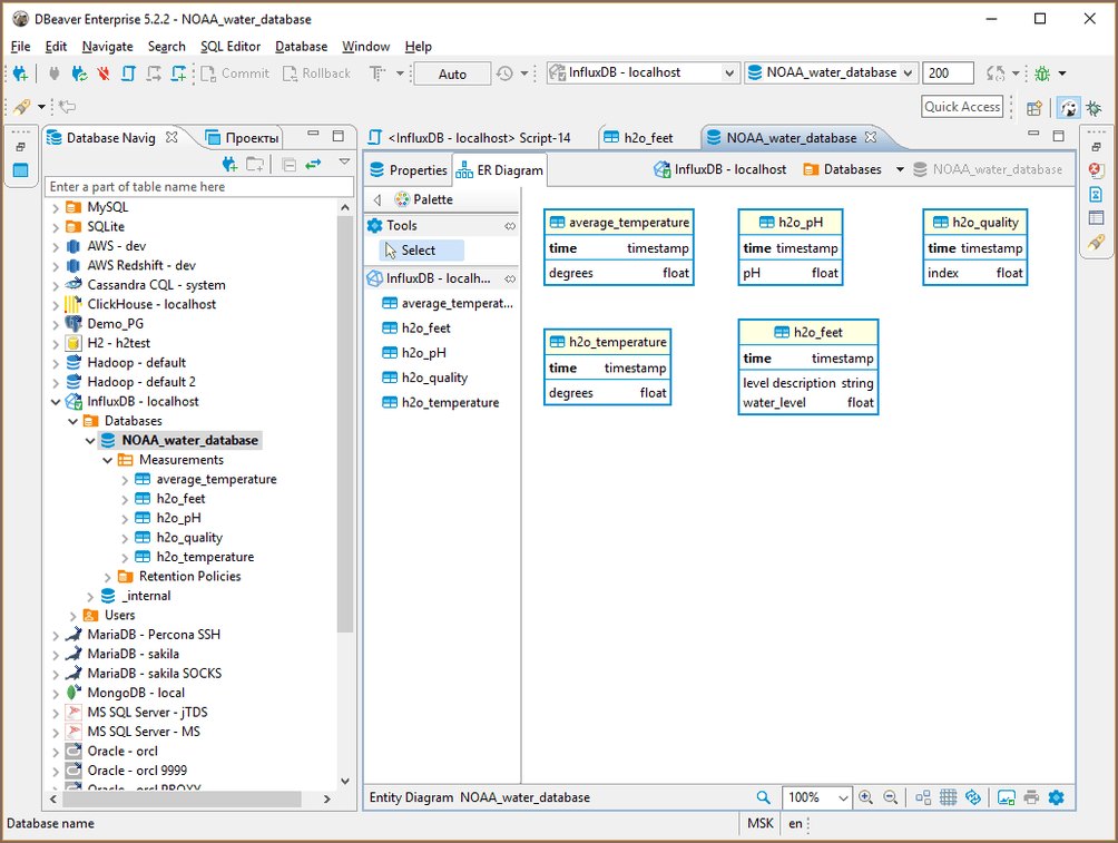 DBeaver supports InfluxDB schema browser, data viewer and InfluxQL queries execution. DBeaver uses InfluxDB Java driver 2.12 to operate with the server over HTTP/HTTPS (standard InfluxDB protocol). It supports InfluxDB servers of any version (in the moment of writing).