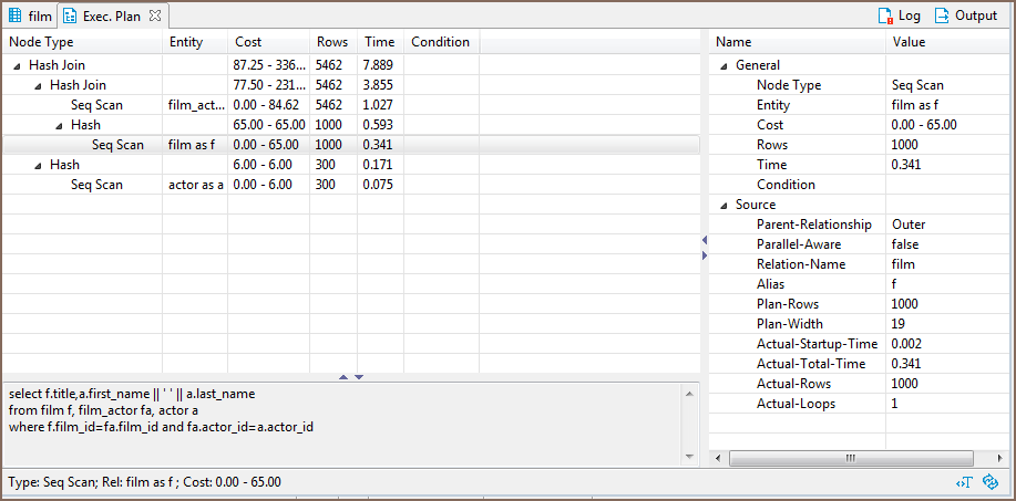If a database driver supports the visualization of the execution plan, you can see the execution plan of the current query (under cursor) by pressing Ctrl+Shift+E or clicking Explain execution plan on the context menu or in the SQL Editor toolbar: