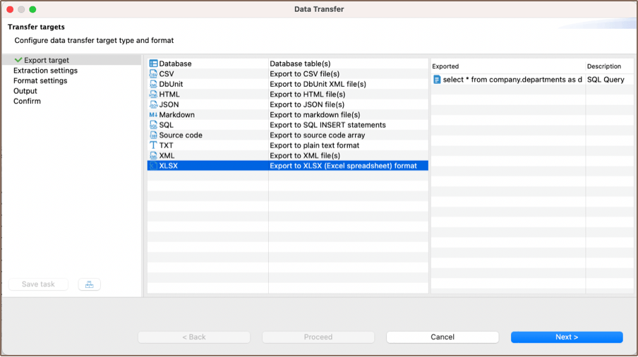 The Data transfer wizard opens. Go through its steps to complete the export of the query.