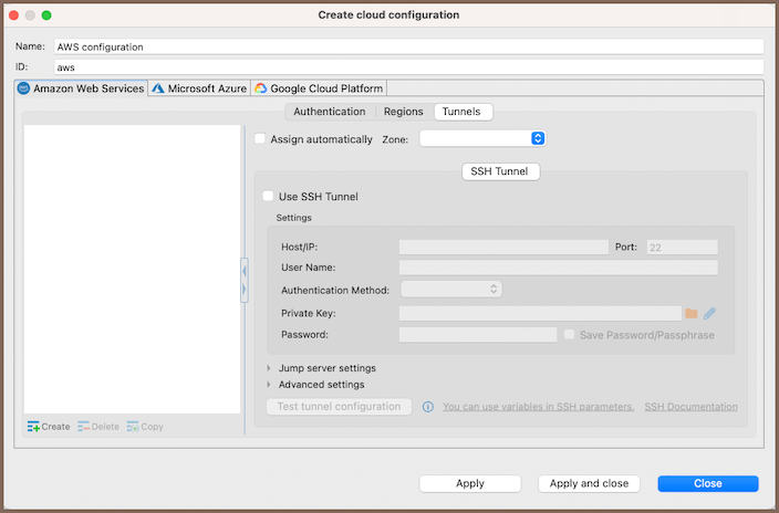This tab allows you to set up SSH tunnels specifically for cloud connections.