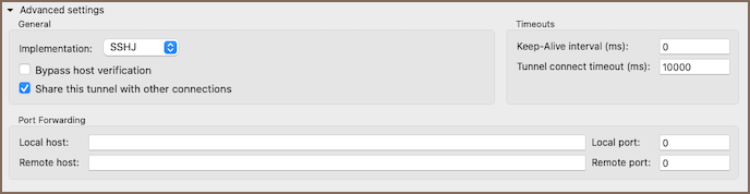 | Share this tunnel with other connections | If checked, allows multiple connections to share the same SSH tunnel. This can improve connection speed and reduce server load. Sessions remain open until all connections using the tunnel are closed, even if the initiating connection is terminated. |