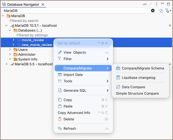 In the Database Navigator, select two objects you want to compare - schemas or databases, depending on what your database supports